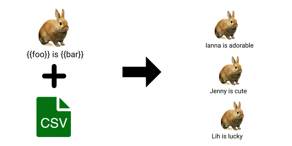 - It automatically replaces all occurrences of {{foo}} and {{bar}} with the content inside the csv file and exports the final image files for you.